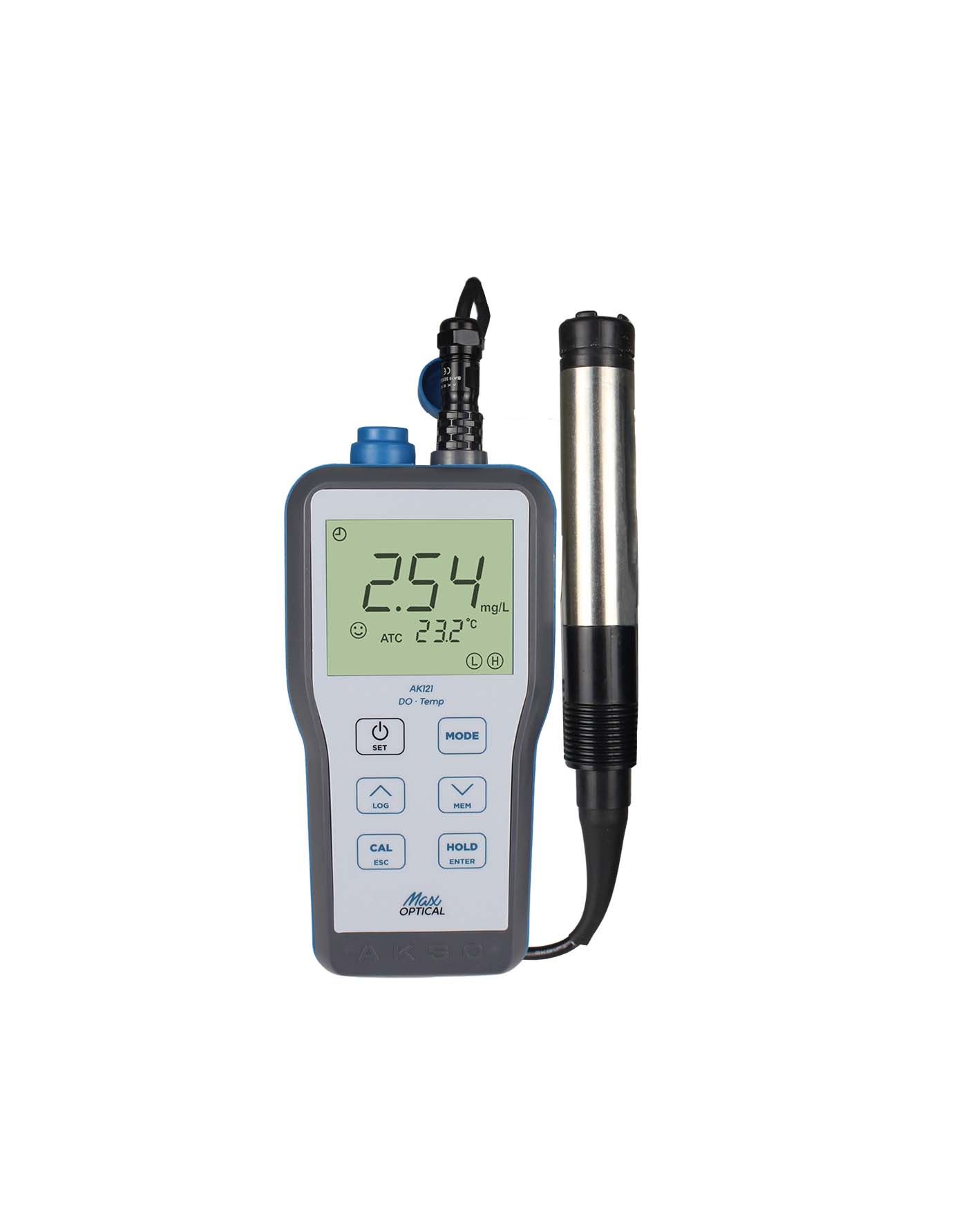 Akso's AK121 is a portable dissolved oxygen meter with an advanced optical probe, designed to provide accurate measurements in a variety of applications. Essential in aquaculture, it guarantees a healthy environment for aquatic organisms, while it optimizes the activity of microorganisms in sewage treatment. In the beverage and food industry, such as in the production of beer and wine, it controls oxygen during fermentation to ensure product quality. In fish farming, it promotes ideal conditions for fish development. Furthermore, it provides accurate data in research laboratories and is crucial to the effectiveness of biological reactors in industrial processes. The AK121 combines accuracy and reliability, meeting a wide range of needs. Key Features of the AK121 Include: - Optical Probe – optical dissolved oxygen sensor provides exceptional accuracy and sensitivity in measurements, with minimized interference from contaminants and reduced maintenance requirements. - Automatic Temperature Compensation (0 to 40°C) and manual adjustments for altitude (0 to 3500m) and salinity (0 to 45ppt), ensuring accurate readings regardless of environmental changes. - Two-Point Calibration: Adjusts to 0% and 100% saturation for accurate calibration. - Automatic shutdown: Saves battery life by turning off the device when not in use.